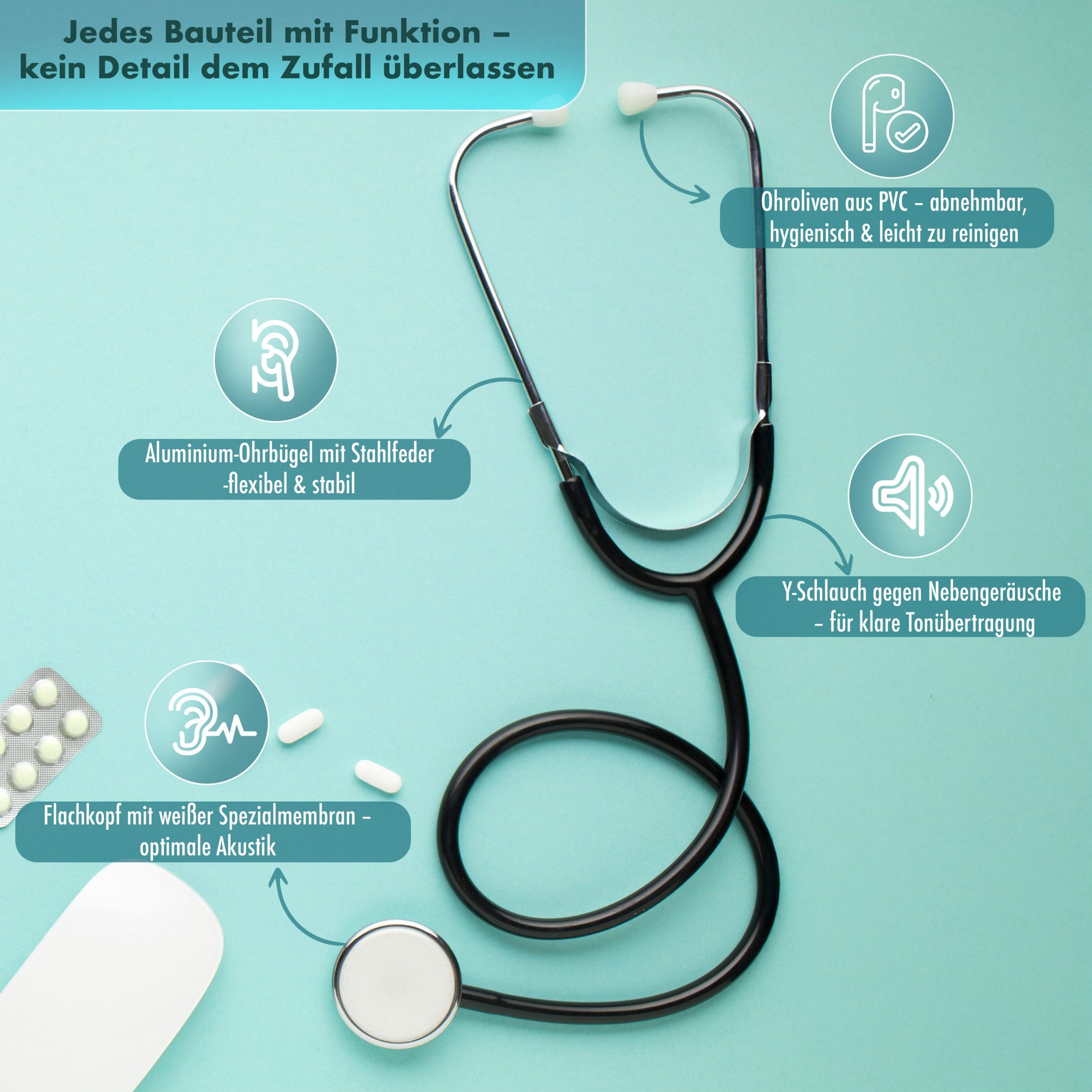 Dank des dickwandigen Y-Schlauchs und der sensiblen weißen Membran liefert das Stethoskop eine präzise Geräuschübertragung – ideal für Herz- und Lungengeräusche.
