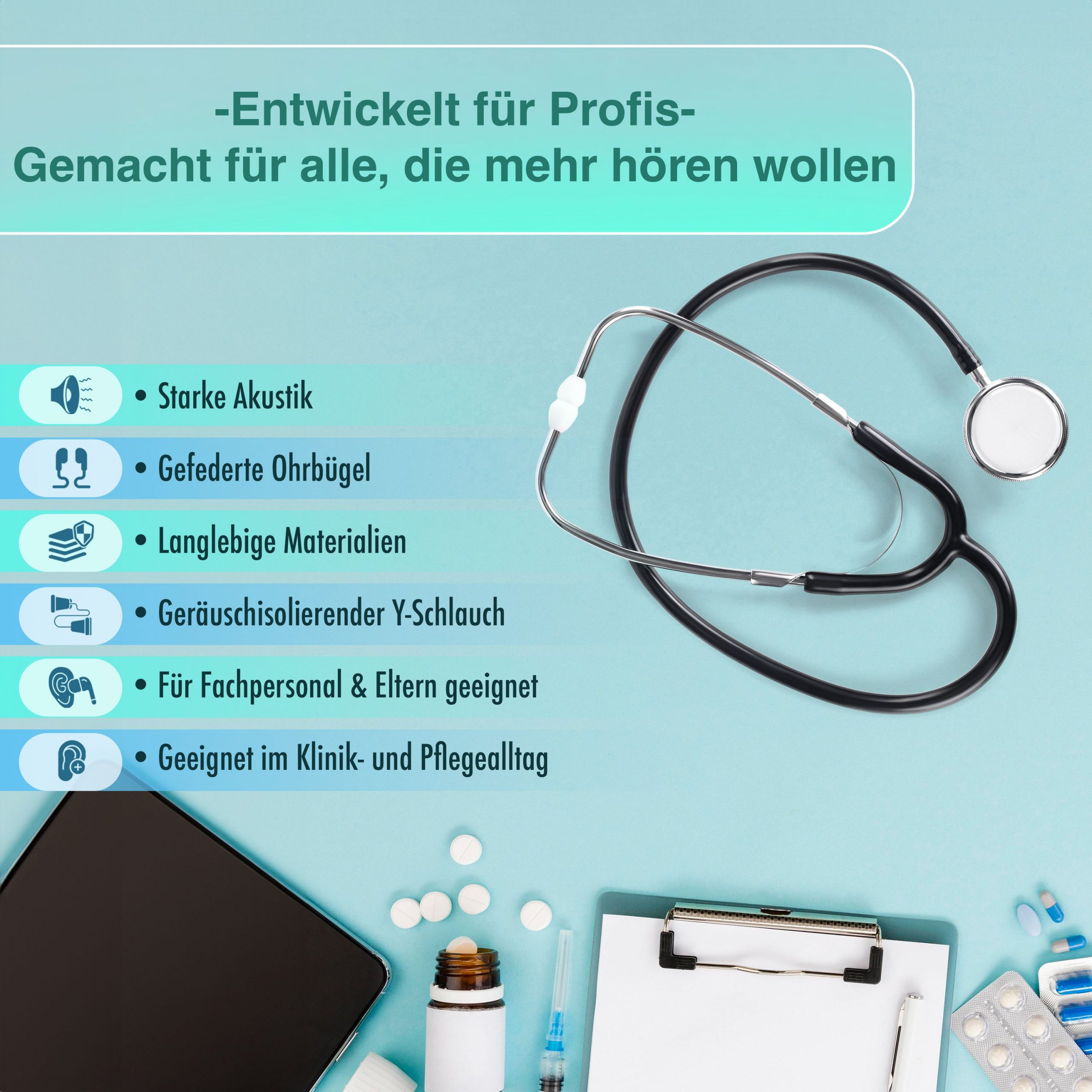 Das Flachkopf-Stethoskop ist aus langlebigen Materialien gefertigt: Aluminium-Kopfstück, geräuschdichter PVC-Schlauch, hochwertig verarbeitet – kein Billigprodukt!